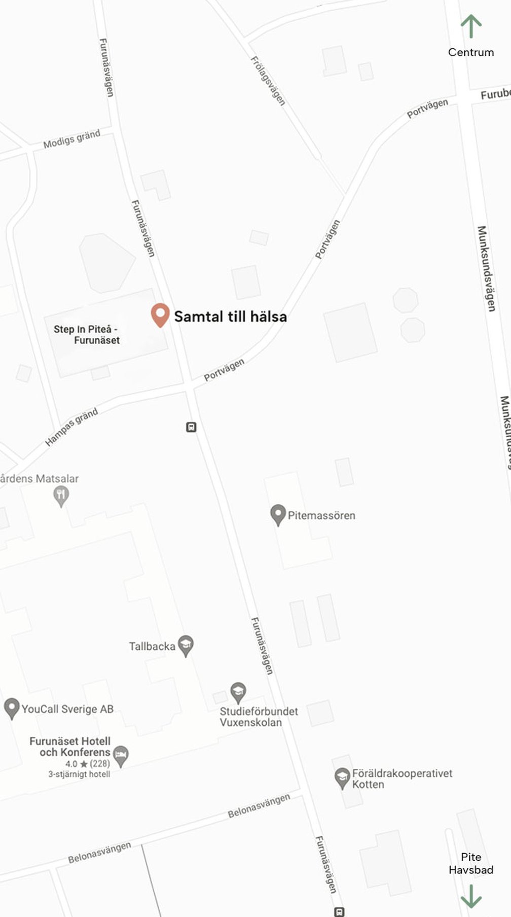Min samtalsmottagning hittar du på Furunäsvägen 100 i Piteå. Gå in vid samma ingång som Step In. Du går en trappa upp och tar direkt vänster.